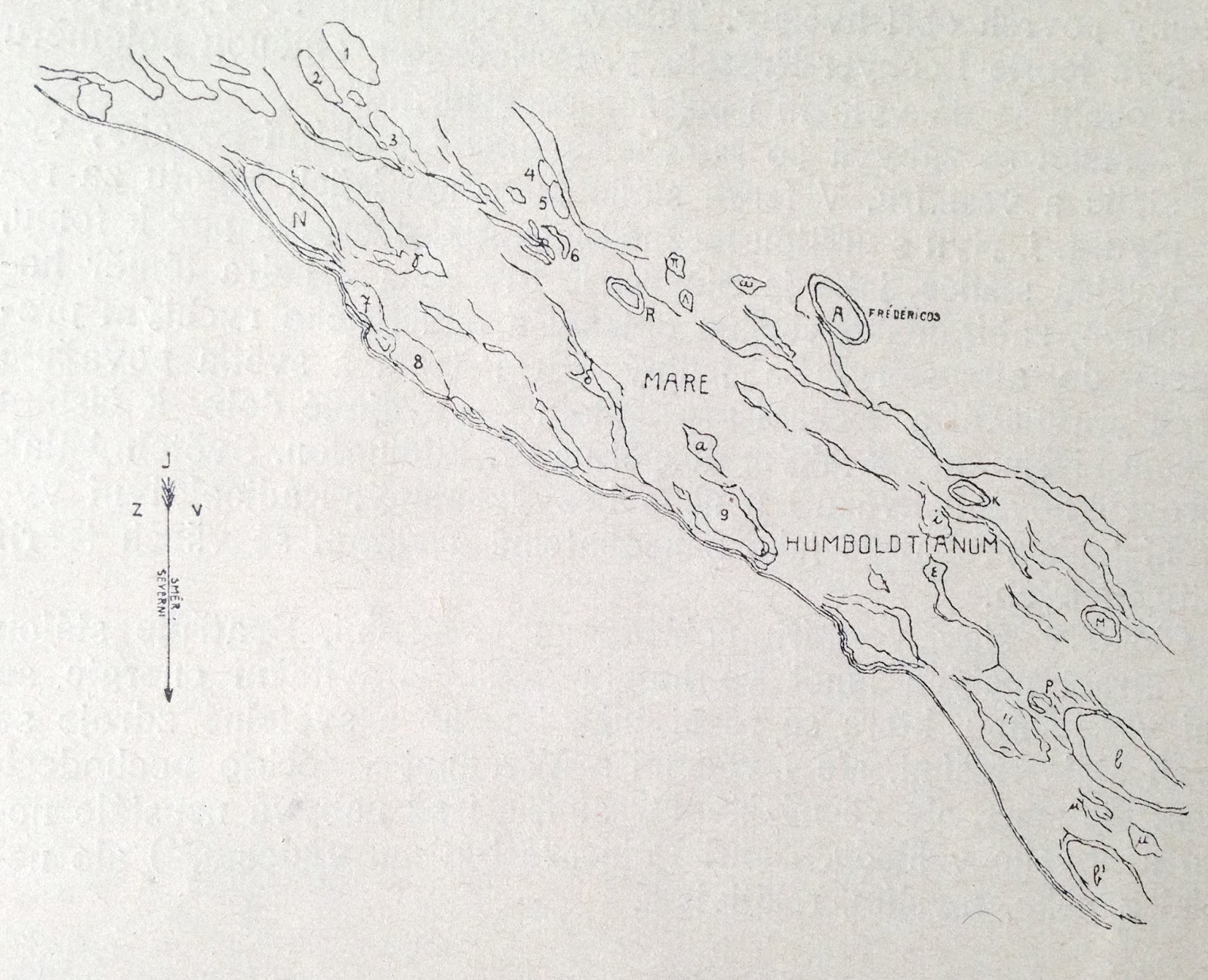 „Tato rozlehlá rovina, jejíhož pravého tvaru nikdy nepoznáte, poněvadž je bezprostředně na severozápadním okraji, měří na viditelném povrchu asi 110 000 kilomtetrů čtverečních. Někdy, když to librace připustí, odhalí nám Mare Humboldtianum část svého zakrytého povrchu. Jest jisto, že tu jde o krajinu měsíčního povrchu, jež jest velmi zvláštní a zajímavá. Všeobecně vzato, jest celá krajina dobře viditelná toliko několik hodin po úplňku. Tehdy vystupují živě stíny na nesmírných, jasných plochách ohromných rozlehlých pustin. Na konec přál bych si, aby naši kolegové upoutali svou pozornost na různé krajiny měsíční, o nichž záznamy jsou neúplné a jež mají tu výhodu, že pozorovatelé se tu mohou státi užitečnými vědě ze všech nejkrásnější.“